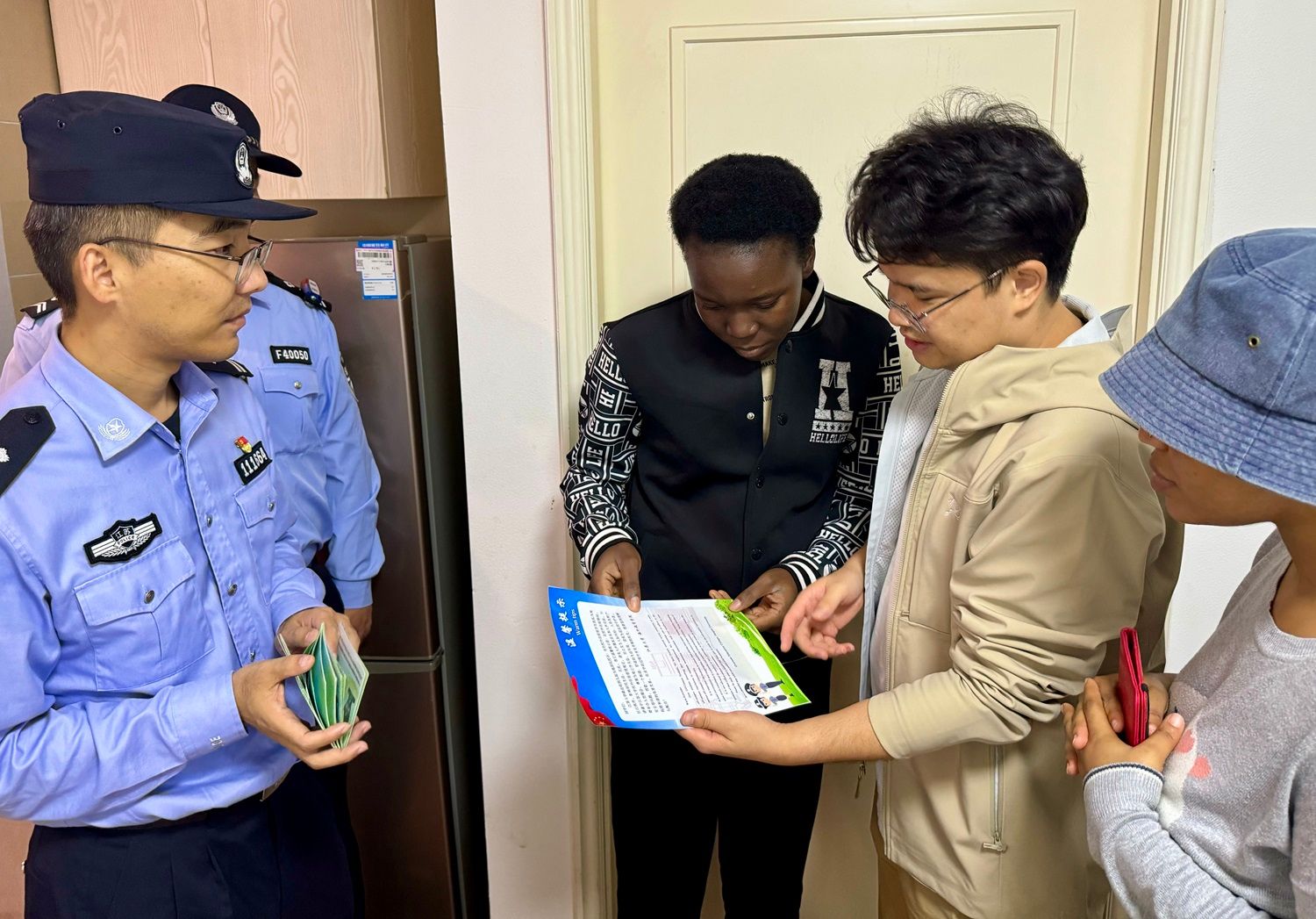 四个走访组重点走访运河印象和悦都荟两个小区的100余名留学生。辅导员详细地了解他们的学习、生活及思想动态,提醒留学生务必遵守中国法律法规和校纪校规,尊重当地的公序良俗,建立和谐友善的邻里关系。公安民警核查了留学生的居留证件和临时住宿登记信息,发放了出入境管理法的宣传单页,提醒留学生及时登记住宿信息、注意消防安全和防范电信诈骗等。